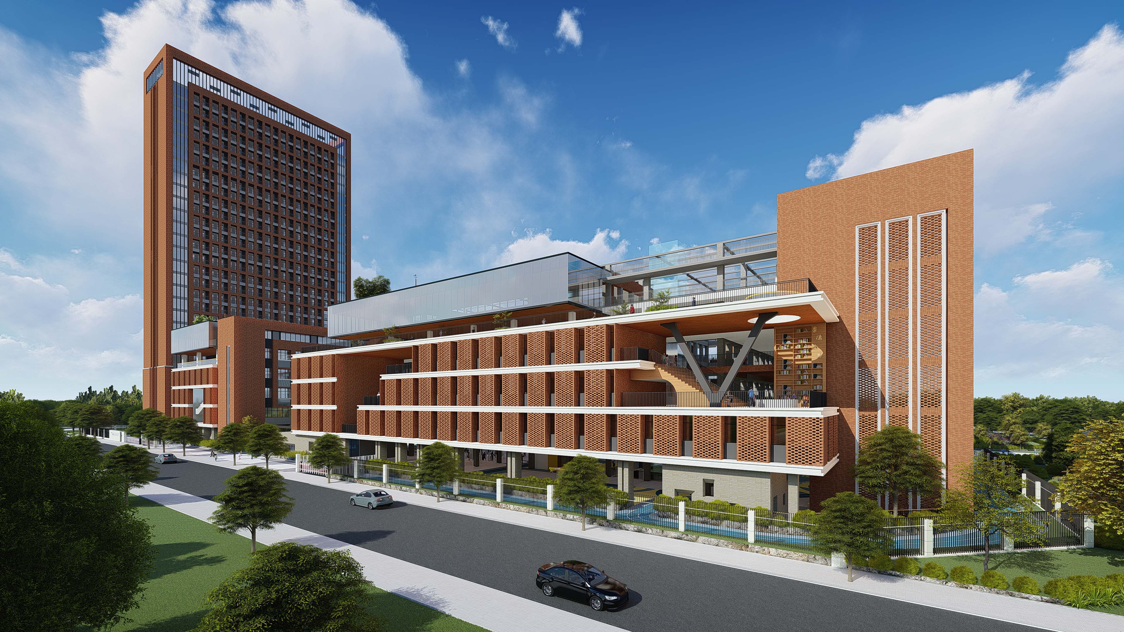 由教科研培訓(xùn)中心、教學(xué)樓、體藝科技綜合樓、綜合樓、風(fēng)雨操場(chǎng)、體育館和綜合實(shí)驗(yàn)體驗(yàn)區(qū)及游泳館等組成的多功能學(xué)校