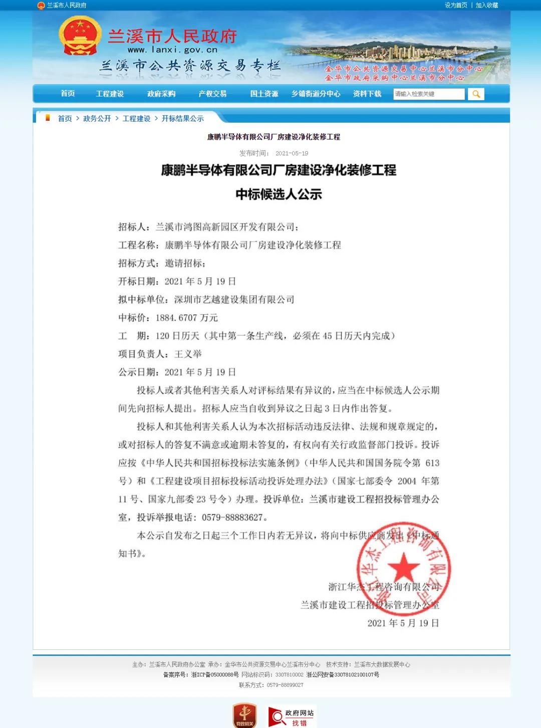 項(xiàng)目名稱:浙江蘭溪市康鵬半導(dǎo)體有限公司廠房建設(shè)凈化裝修工程;