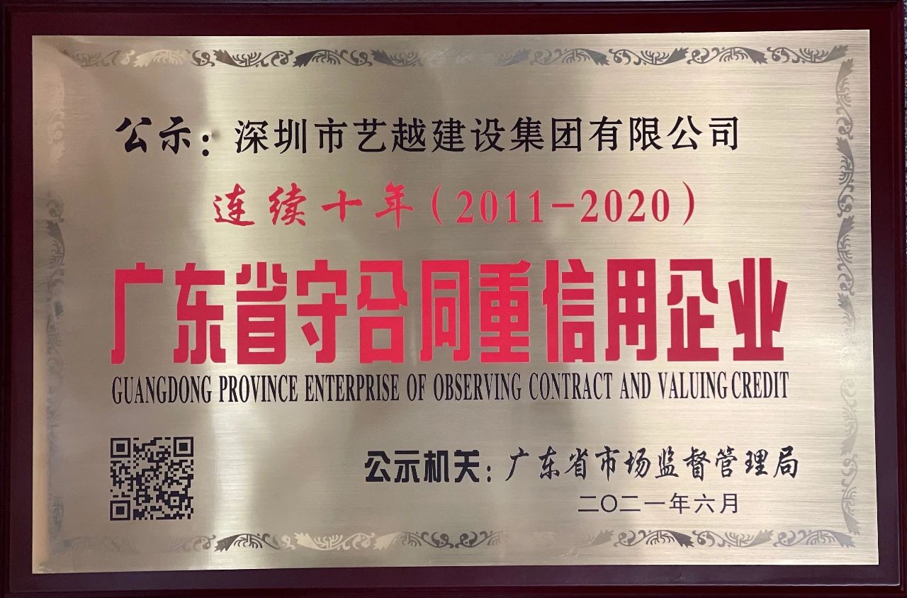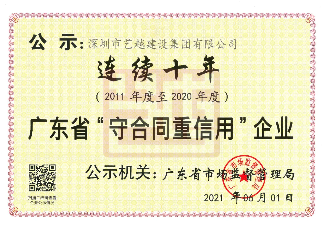 同時(shí),在廣東省市場(chǎng)監(jiān)督管理局發(fā)布的2020年度“守合同重信用”企業(yè)公示中,藝越建設(shè)集團(tuán)連續(xù)10年榮獲廣東省“守合同重信用”榮譽(yù)稱號(hào)。