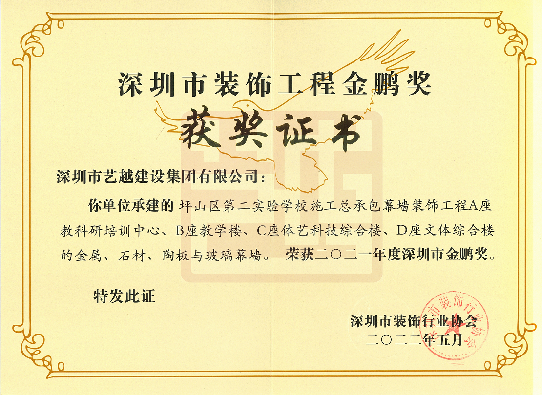 近日,在深圳市裝飾行業(yè)協(xié)會(huì)發(fā)布的“2021年度深圳市裝飾工程金鵬獎(jiǎng)”評(píng)選結(jié)果公告中,由藝越建設(shè)承建的“坪山區(qū)第二實(shí)驗(yàn)學(xué)校施工總承包幕墻裝飾工程”榮獲“2021年度深圳市金鵬獎(jiǎng)”,為我司獎(jiǎng)項(xiàng)榮譽(yù)錦上添花!