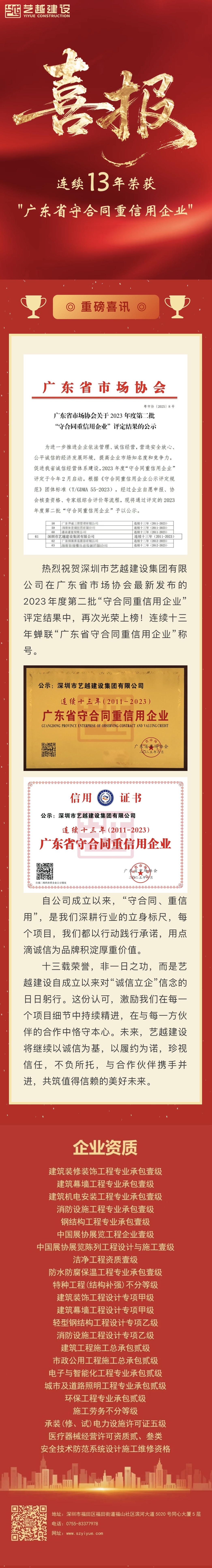 連續(xù)13年!藝越建設(shè)集團(tuán)再獲“廣東省守信用重信用企業(yè)”稱號(hào)