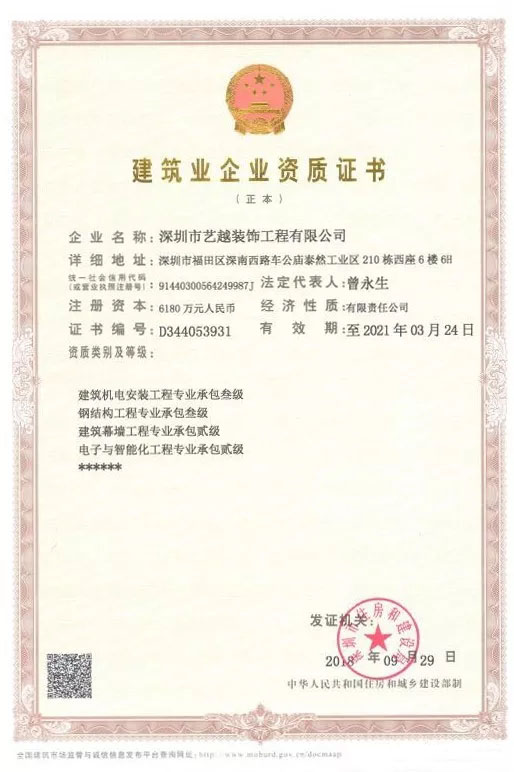 在各級領(lǐng)導的關(guān)懷與全體同仁的共同努力下,藝越裝飾資質(zhì)平臺建設(shè)取得了新的進展,新申辦的電子與智能化工程專業(yè)承包貳級資質(zhì)成功獲得審批。